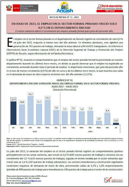 En el mes de julio de 2023, el EMPLEO en el sector formal privado registró un ligero crecimiento de 0.9% en la región de Áncash. Así informó el Observatorio Socio Económico Laboral (OSEL) de la Dirección Regional de Trabajo y Promoción del Empleo (GRTPE) de Áncash, a través de la siguiente nota de prensa que contiene información sobre la variación anual del empleo según ramas de actividad, sexo, grupos de edad, nivel educativo y por tamaño de empresa.